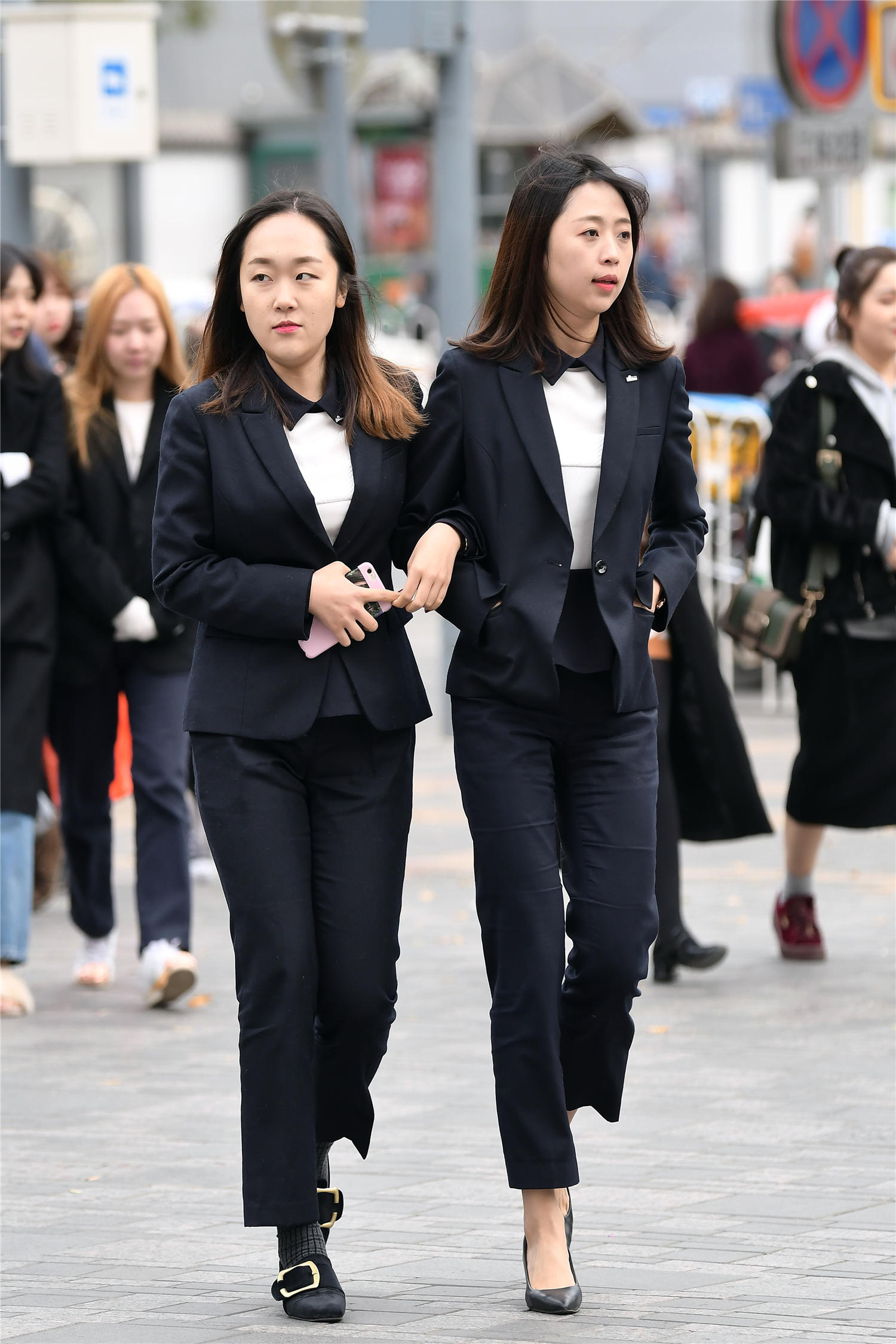 很多职场女士,会搭配西服套装,深蓝色的西服套装,会穿出很美的效果,这两位小姐姐都选择西服和西裤的搭配,非常相似的搭配,但是身材不一样,搭配的鞋子不同,搭配出差别的感觉,一位选择一双黑色短靴,尖头款式,金属扣增加装饰效果,另一位选择尖头细跟皮鞋,衬托身材高挑,也搭配出简约的感觉。