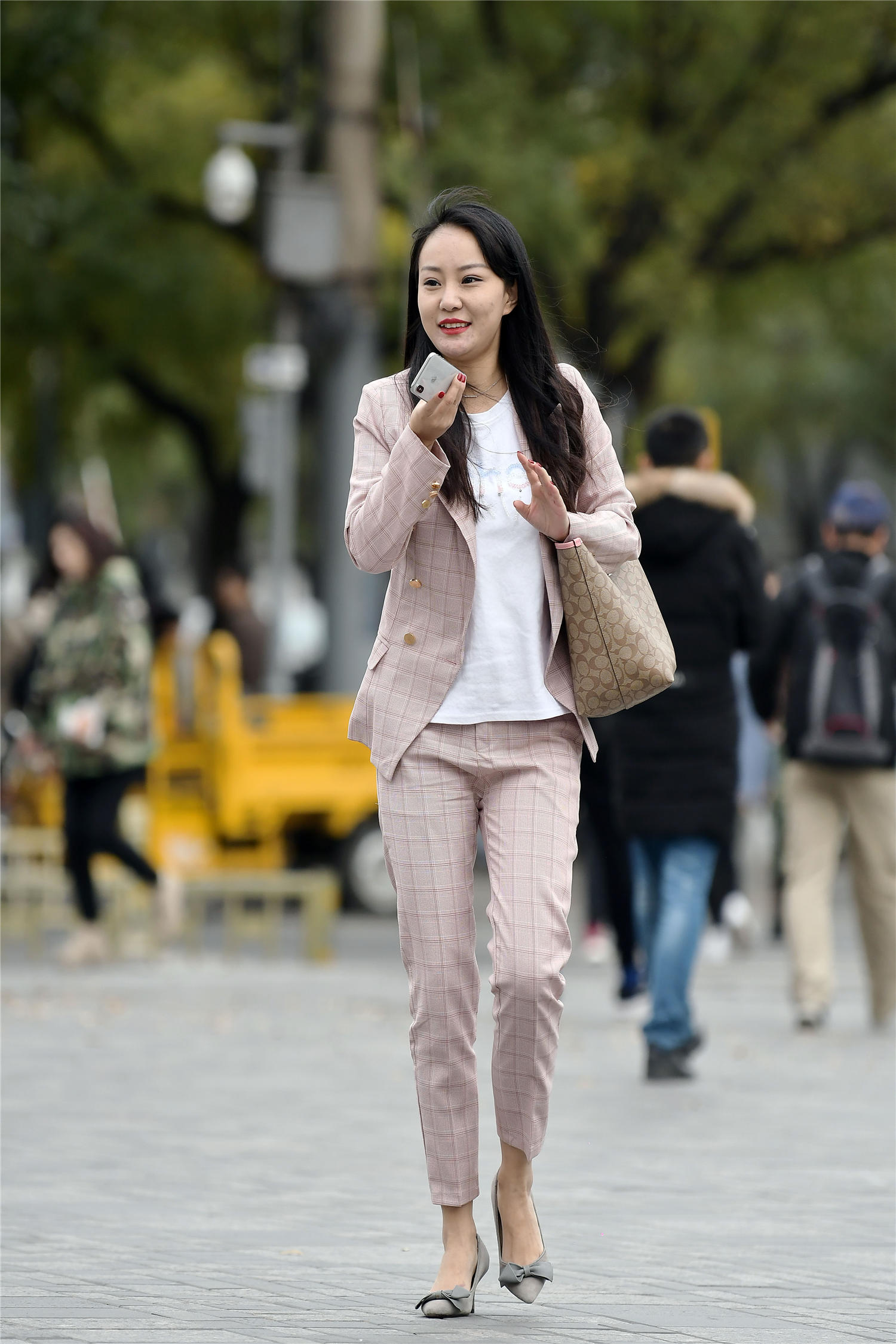 西服套装,有很多色彩和款式,这位美女选择一款暖色一些的格子西服,小西服搭配九分西裤,非常简单,也有着很美的效果,穿出自己的感觉才是最好,一款白色半袖作为内搭,很多人穿着西服不会系扣子,这样显得休闲一些,因为是要去逛街,脚下是灰色的尖头细跟单鞋,没有选择太高鞋跟的,走路会很轻松,穿出很休闲的感觉。