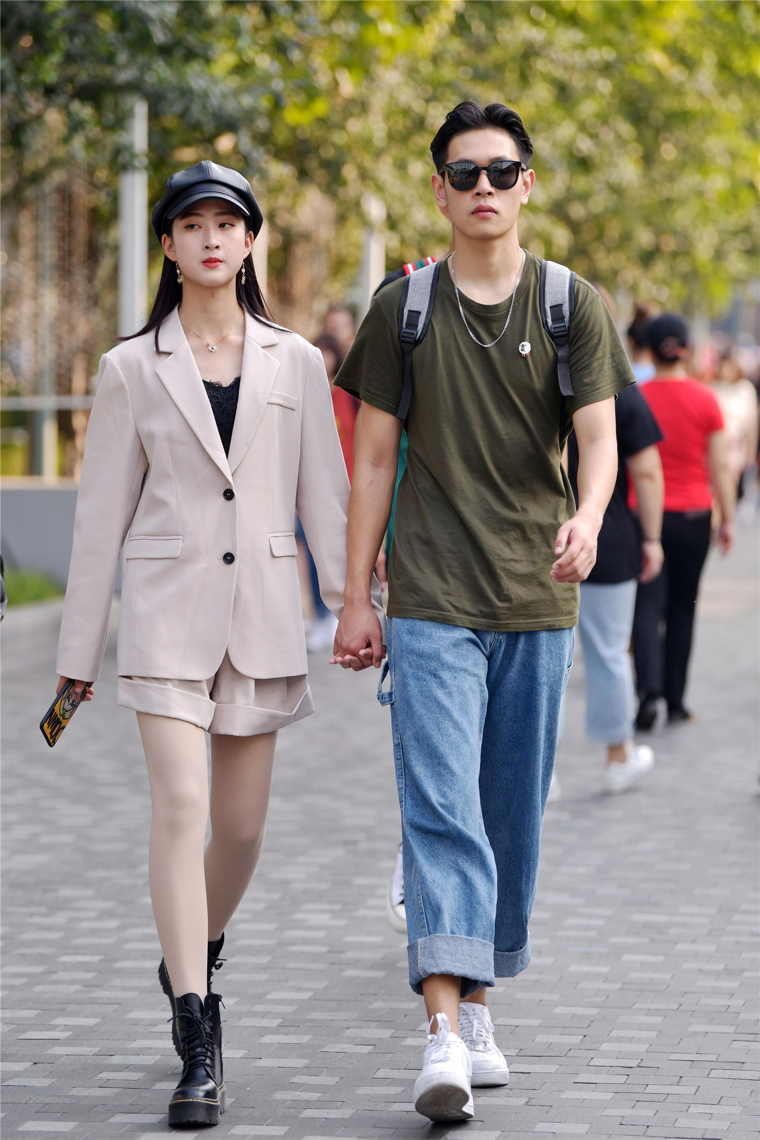 西服也受到很多姑娘喜欢搭配,穿出自己的时尚感觉,这位美女选择一款米色西服,搭配米色的短裤,和西服相同的材质,翻边的设计,搭配出一点休闲的感觉,逛街穿着会显得很个性,当然肉色的丝袜,也会起到很好的修饰效果,脚下穿着一双黑色的马丁短靴,一顶黑色皮帽子,也搭配出很精致效果,上下呼应的搭配。