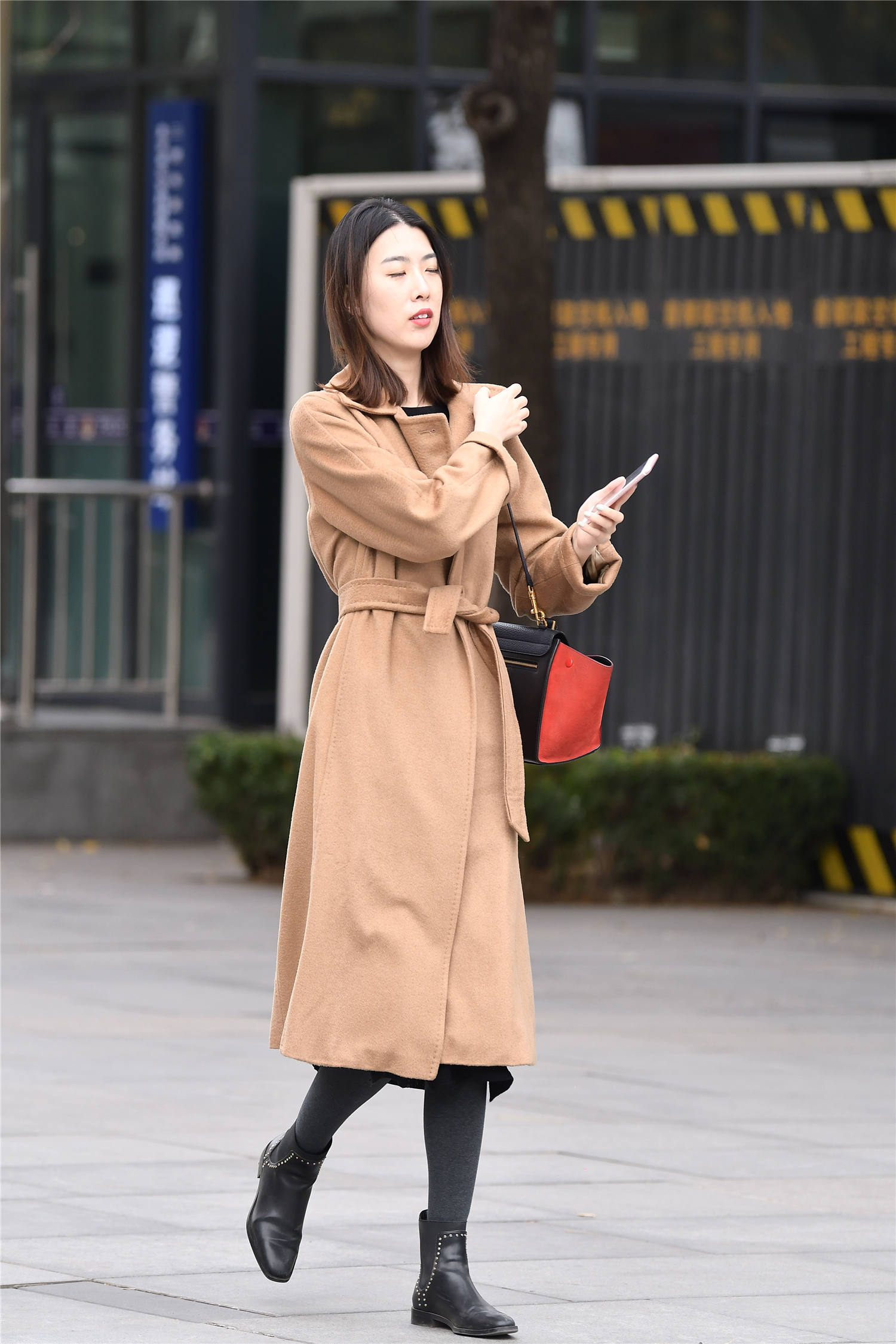 每一位时尚姑娘,要搭配出自己的味道,穿出自己的气质才是最重要的,这位美女选择一款驼色的大衣到小腿肚的位置,非常显身材,腰间的腰带简单的系一下,显得身材高挑,一条深灰色的打底裤,显瘦效果很好,搭配一双黑色的皮质短靴,金属铆钉增加色彩和层次感,姑娘非常会选择搭配。