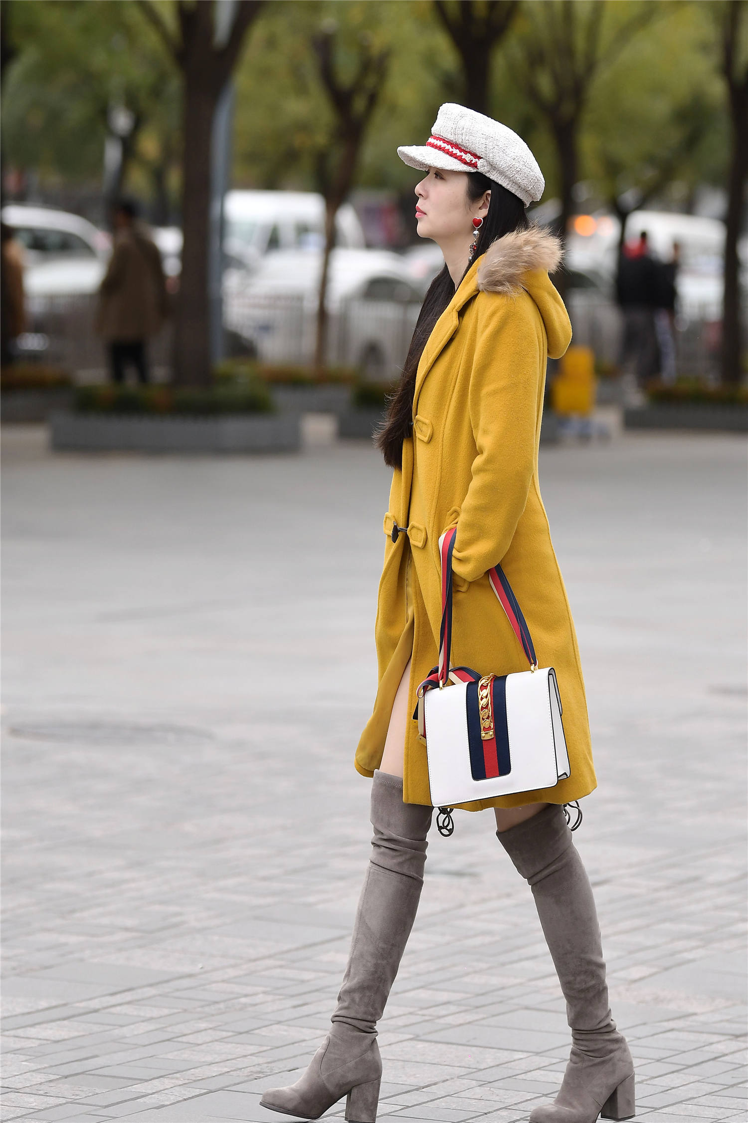 穿着一款好看的大衣,会让你变得不一样,简约还显得大气,这位美女选择黄色大衣,非常好看的色彩,搭配一款灰色的过膝长靴,粗跟的款式,走路很稳,这样的搭配也会很简单,搭配出自己的味道,露出大腿,这样会显得不是很冷,一顶白色帽子,粗呢针织的款式,现在很多人喜欢戴着帽子出行,可以修饰自己的脸型。