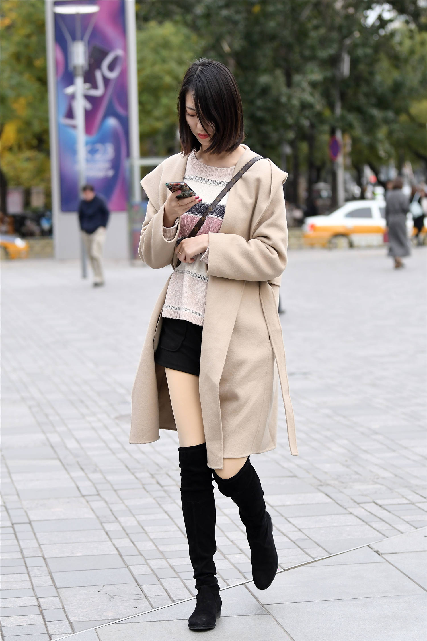 精致的姑娘,总是搭配出层次效果,这位美女选择一款米色的中款大衣,敞开怀,露出里面的内搭,非常简约的款式,一双黑色过膝长靴,搭配肉色打底裤,黑色短裤衬托出层次和色彩,浅色的条格毛衣,有着精致的感觉,一头扣发,看着就非常好看,在春天这样搭配,好看还精致,穿出时尚的感觉。
