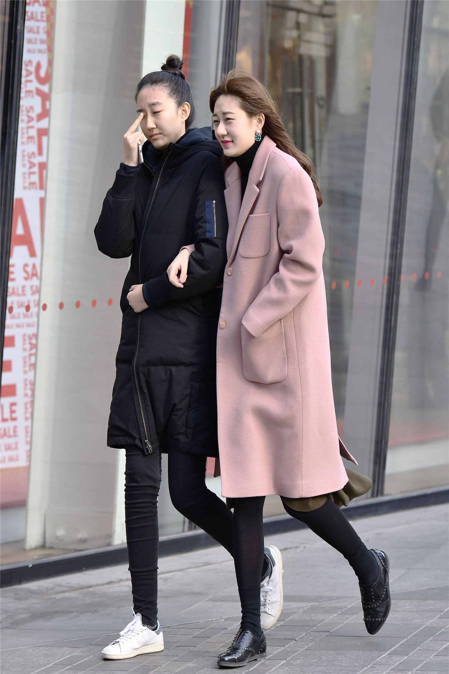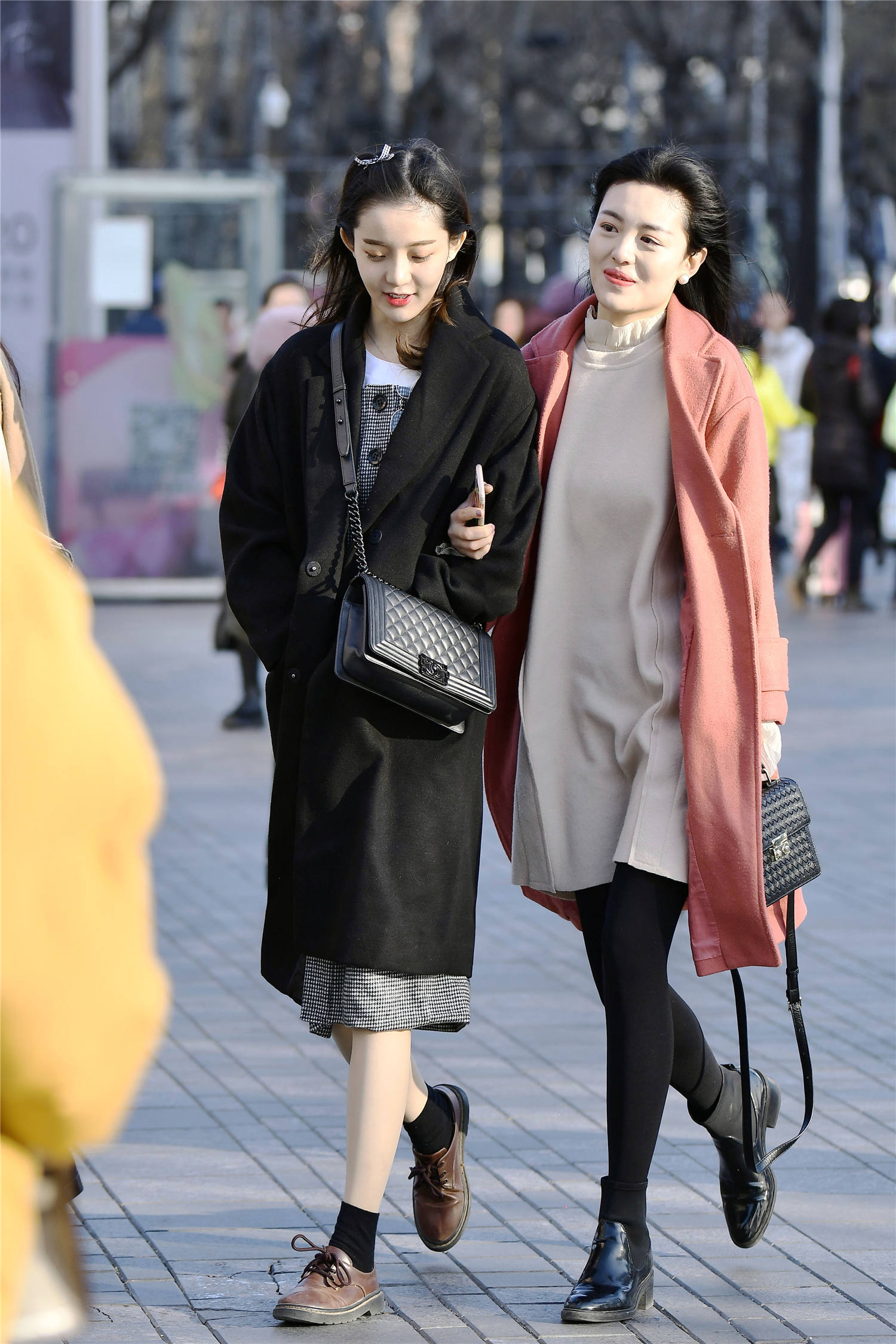 很多人逛街喜欢约着自己的姐妹一起,这样搭配就会更加讲究呢,看一下这两位小姐姐的搭配,一位选择浅粉色的呢子大衣,里面是米色的连衣裙,黑色打底裤搭配一双平底短靴,非常好看,她的姐妹是一款黑色大衣,里面是灰色格子长裙,肉色打底裤搭配黑色短装袜子,脚下的平底系带皮鞋,显得精巧细致。