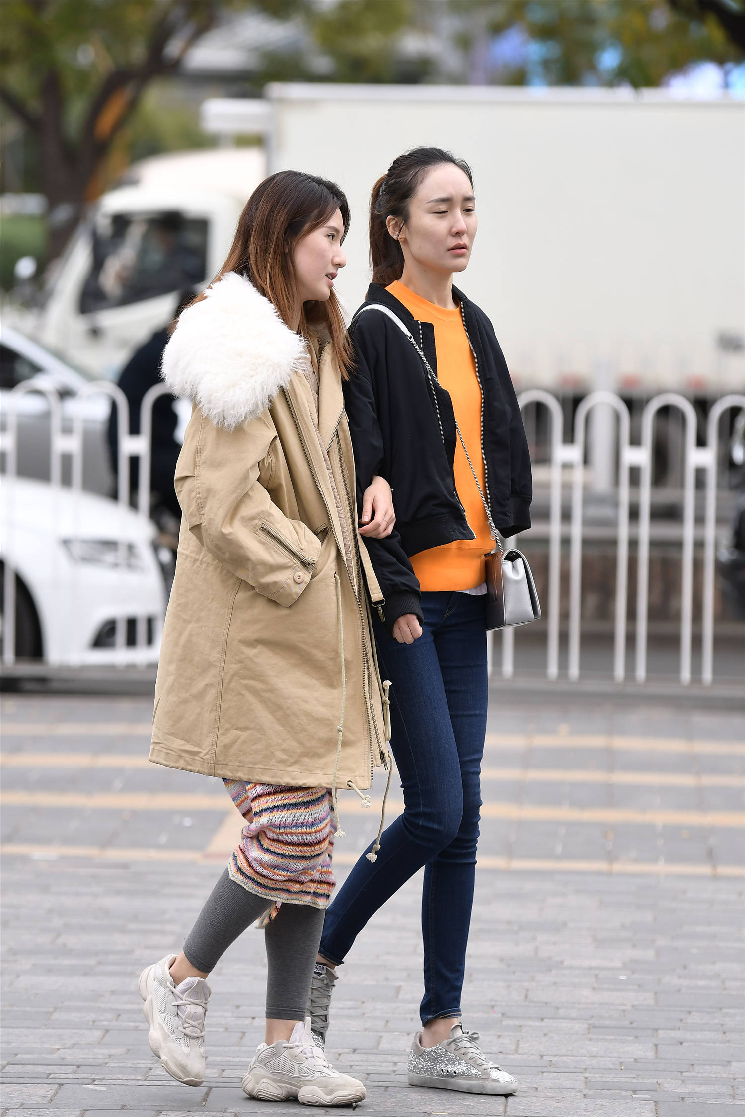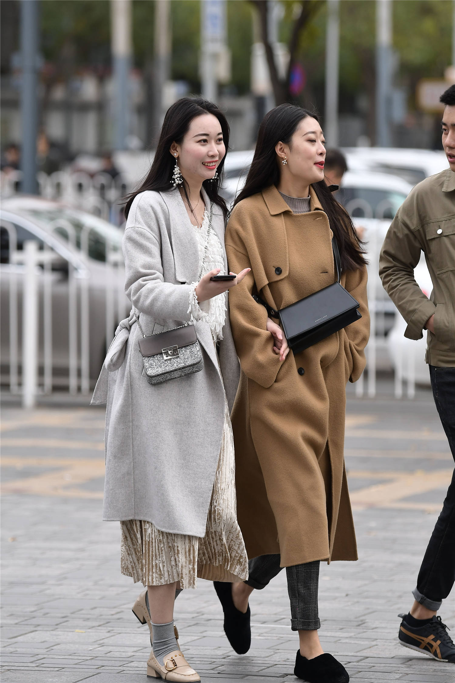 这两位小姐姐,一位选择驼色大衣,搭配一条深灰色条格的修身裤子,露出脚踝,搭配很简单,也衬托出色彩,脚下一双黑色的棉鞋,有着保暖的效果,她的姐妹选择灰色的长款呢子大衣,白色的流苏小衫,搭配一款香槟色的长裙,脚下一双灰色高筒袜,搭配一双平底的粗跟单鞋,2厘米的鞋跟,简单好看的一款鞋子。