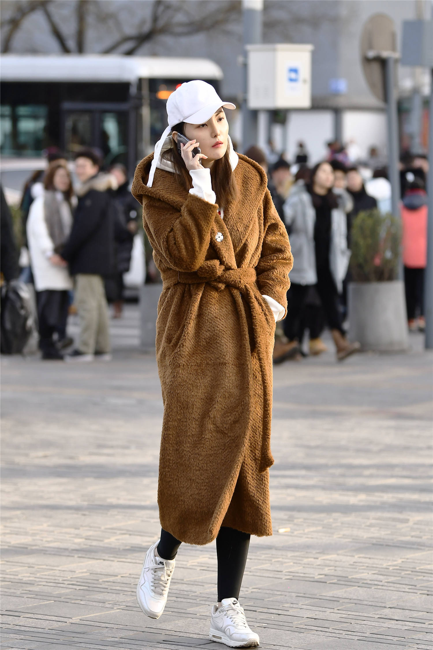 选择大衣,很多人会选择一些个性一些的,这位美女选褐色的抓绒大衣,非常厚实的效果,也有着很好的保暖效果,这样的大衣,会让你的搭配变得更加简单,腰带系上,有着显瘦的效果,还衬托身材比例很好,黑色打底裤搭配白色运动鞋,色彩对比很好看,白色的鸭舌帽,也会显得休闲味道十足。