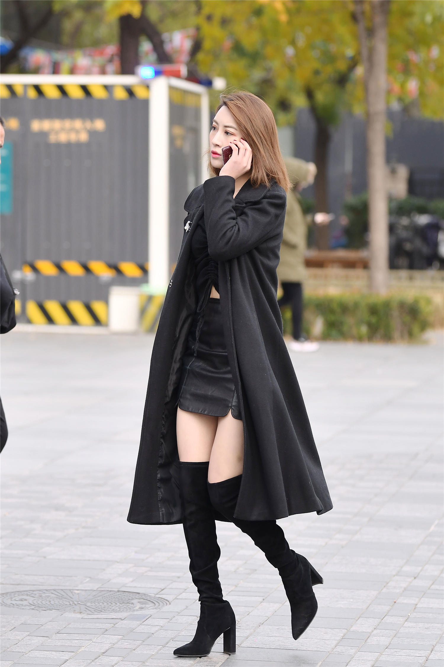 很多时尚姑娘喜欢长靴搭配,到了初春时节,要选择高跟鞋,会更好地衬托身材高挑,要搭配出苗条的效果才好,这位美女选择一款尖头粗跟过膝长靴,搭配一款黑色高腰皮裙,非常显身材高挑,露出一段大腿,这样显得搭配非常好看,一款黑色风衣,没有系扣,衣摆飘起来,有着带风的感觉,一身黑色也搭配出出很美的效果。
