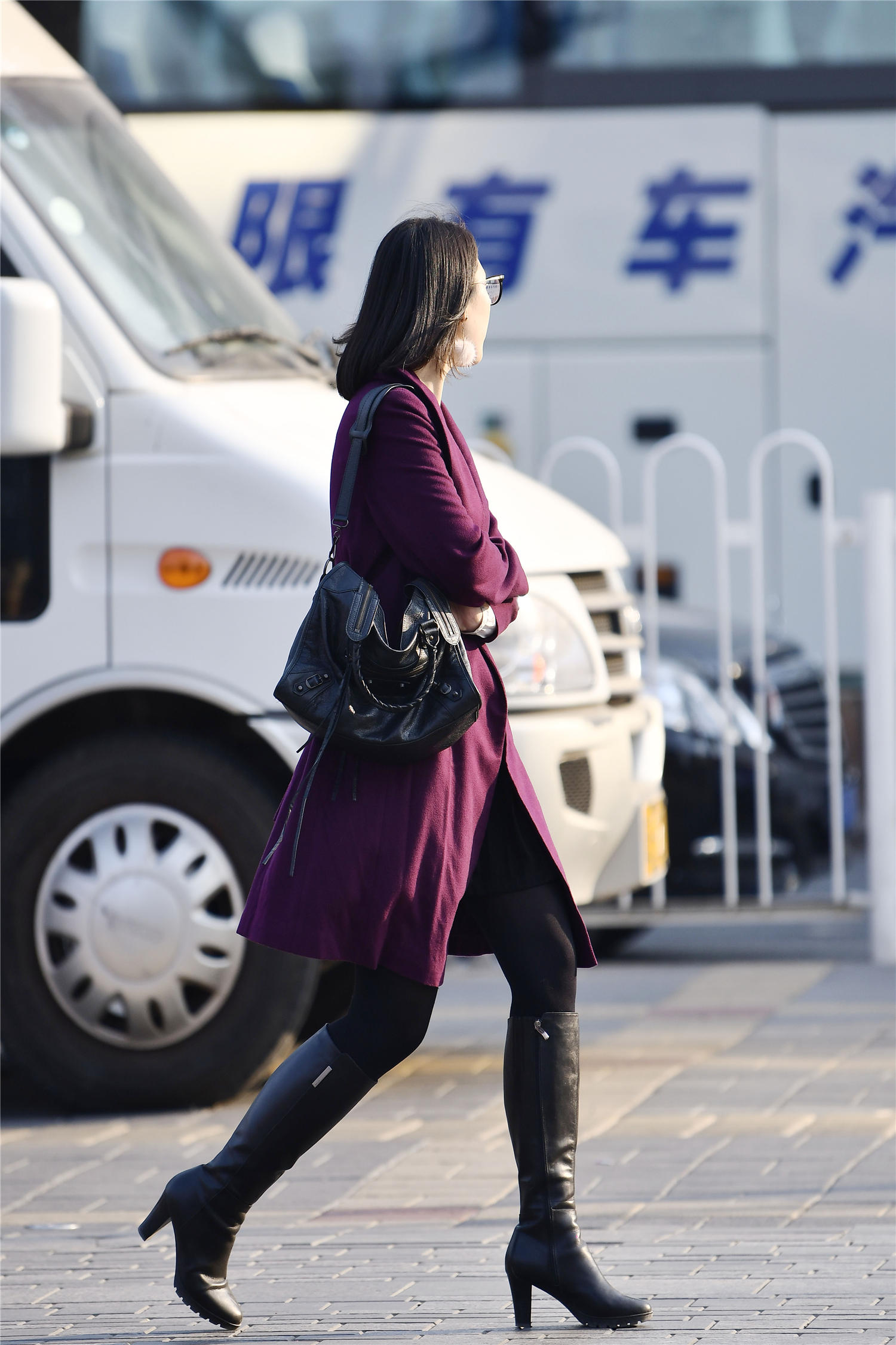 有质感的靴子,还是要选择皮靴,这位美女选择一款黑色的皮质长靴,鞋跟不是很粗,但是却很精致,6厘米左右的高度,黑色紧身裤,搭配出显瘦的效果,也有着层次感,一款紫色的大衣,及膝的款式,皮肤白皙的姑娘,才会搭配出精致的感觉,一款黑色单肩包,看出一些休闲的效果,这样搭配很美。
