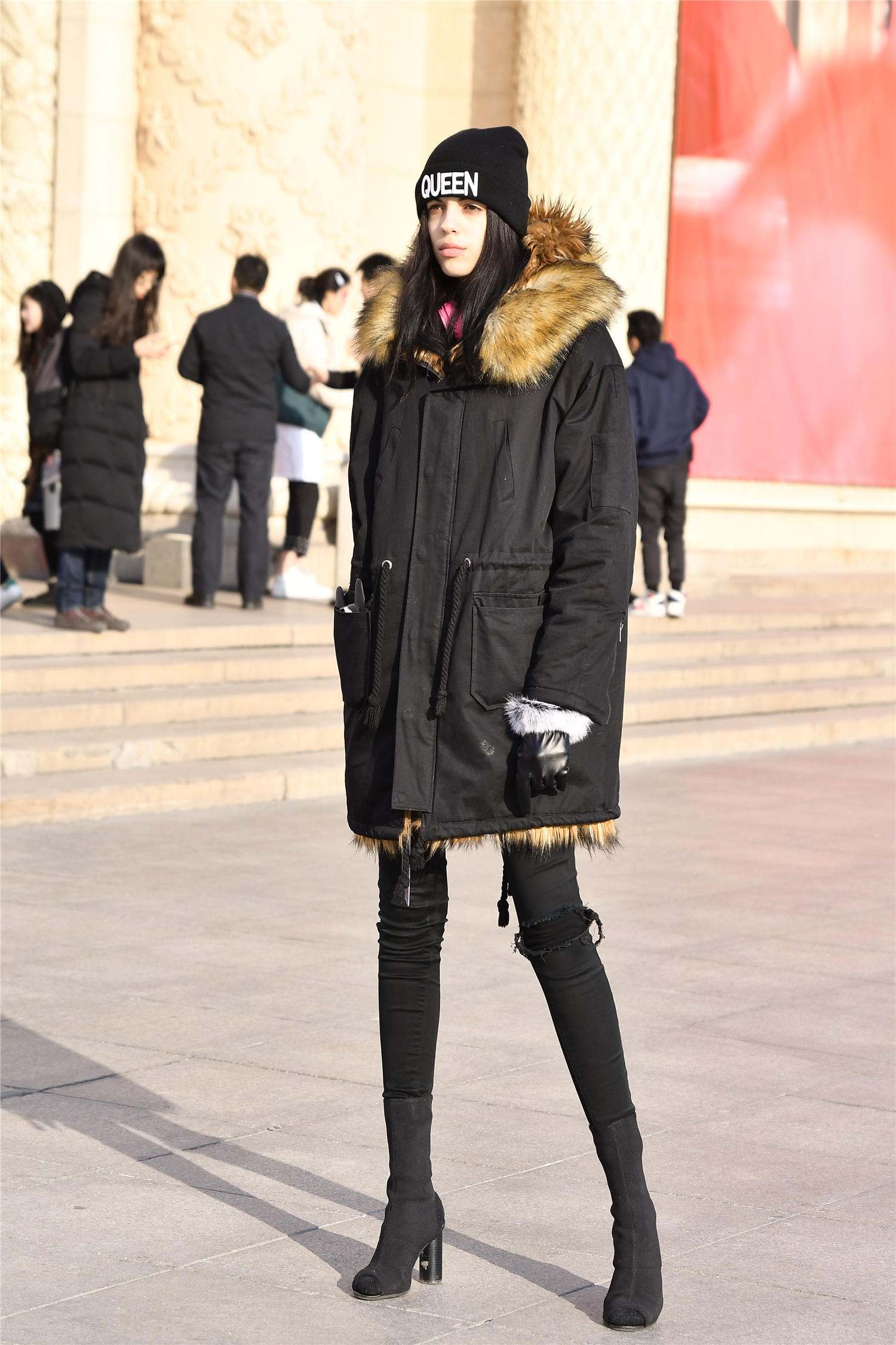 一双好看的过膝靴,也需要好身材衬托一些,这样才会搭配出精致的感觉,这位美女身材高挑,模特身材就是容易搭配,但是生活中的她们还是很注意保暖的,一款黑色过膝长靴,粗跟的款式,显瘦效果很好,黑色紧身牛仔裤,膝盖处的破洞处理,增加个性,也有着很好的显瘦效果,黑色的中款大衣,衬里是暖色的皮草,非常好看,头上戴着针织帽,保暖还显脸小。