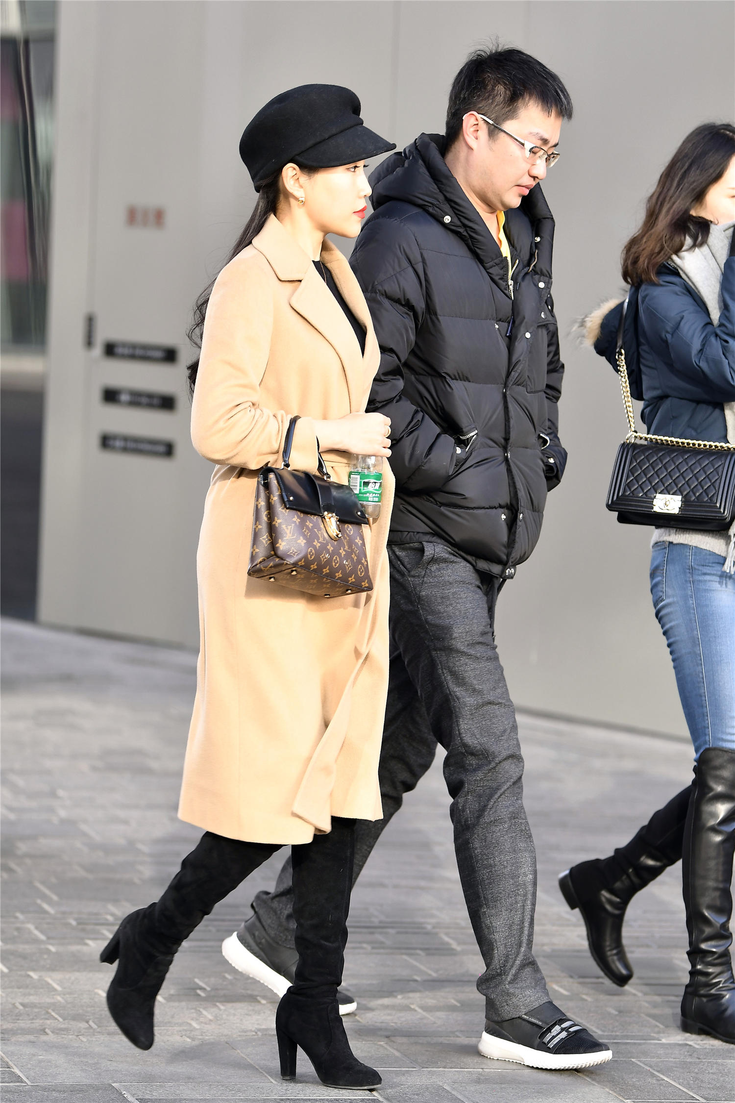 长靴也可以搭配出简约的效果,美女也有着自己的长靴款式,过膝靴是很经典的一款靴子,保暖效果很好,也让搭配变得更加简单,这位美女选择一款黑色的尖头粗跟过膝靴,修身的款式,有着显瘦的效果,搭配一款米黄色的长款大衣,腰间的腰带让她的身材比例更好,头上戴着一顶帽子,保暖还很精致。