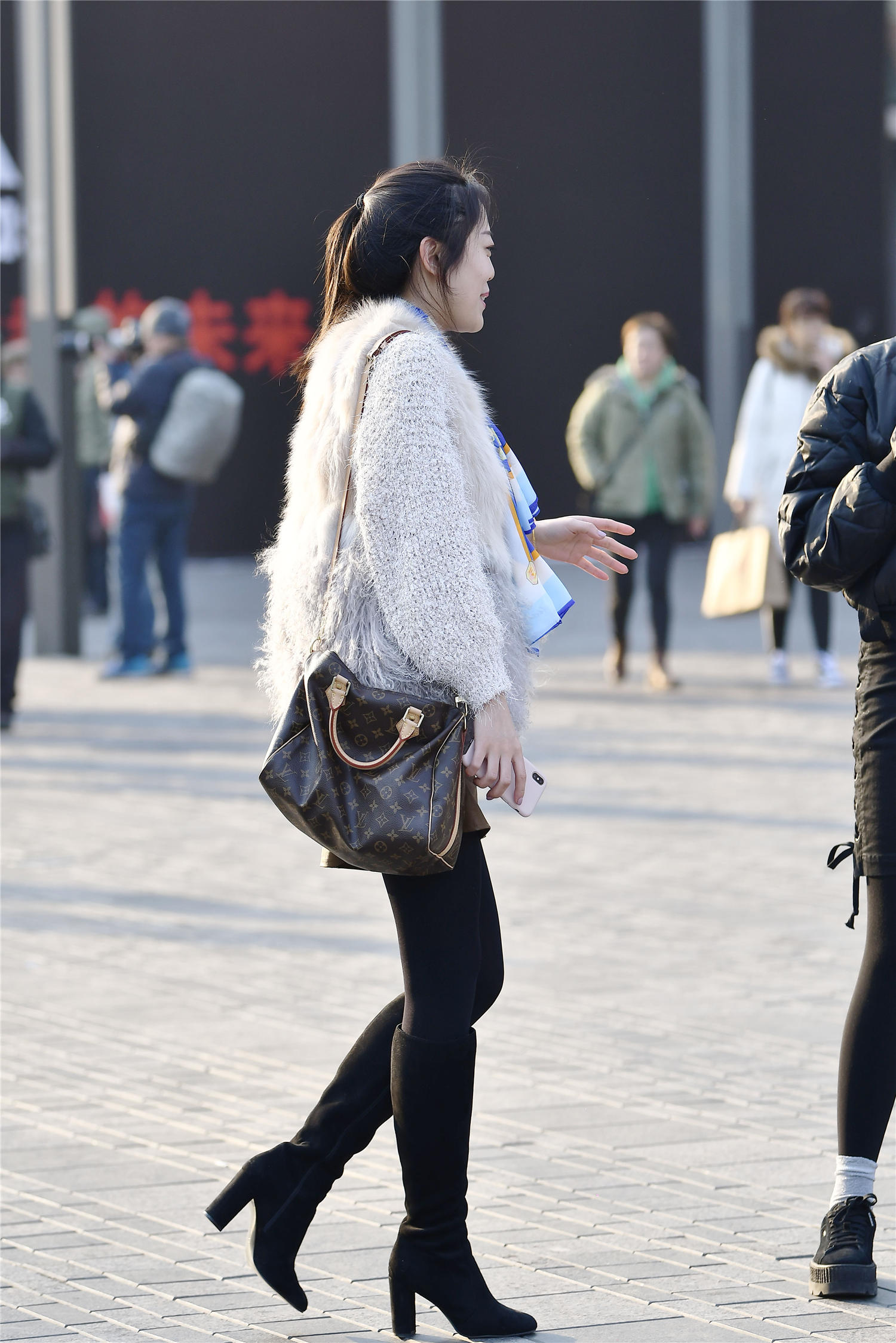 很多人喜欢长靴,特别是到了春天,非常适合穿搭,保暖时尚,选择简约的长靴,会很好看,这位美女穿着一款黑色粗跟过膝靴,靴子非常简约,也有着很好看的弧度,搭配黑色紧身裤,把自己身材现出来,匀称纤细,一款浅灰色的皮草马甲搭配灰色针织毛衣,非常好看的浅色系搭配,经典的单肩包,显得非常贵气,还增加个性。