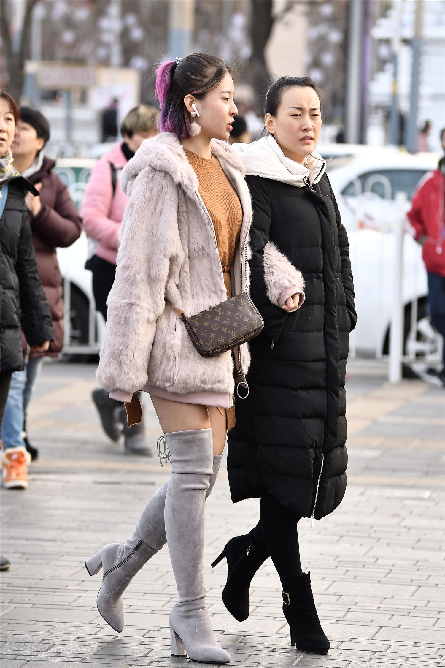 长靴怎么搭配出自己的味道,选择款式要适合自己的身材,高跟会衬托身材高挑,这位美女选择灰色的尖头粗跟过膝靴,身材微胖,却非常匀称,高跟显得身材高挑一些,褐色的衬衣搭配灰色的皮草外套,这样穿搭很简单,却搭配出很有层次感绝,头发染成粉色一些,这样的色彩还真需要年轻的姑娘来驾驭。