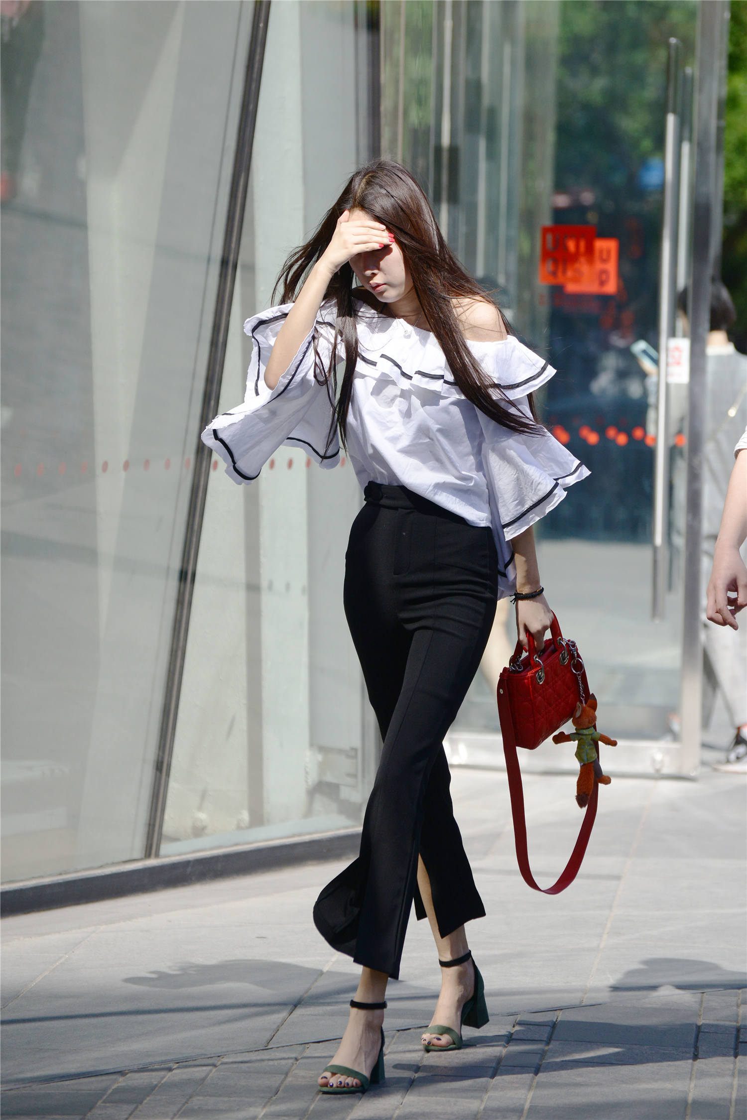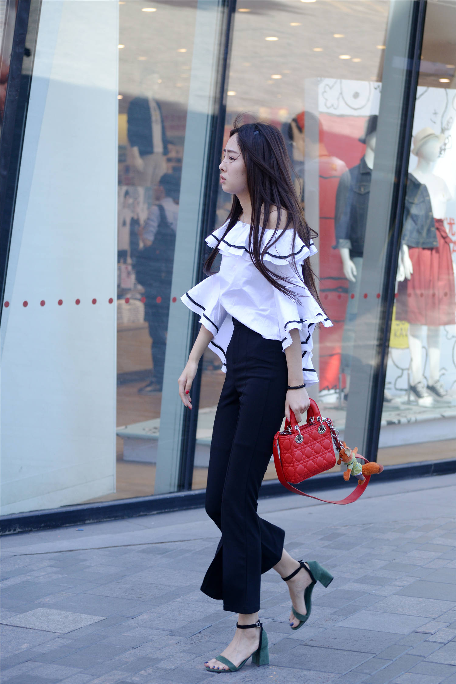 这位美女选择一款黑色九分的高腰长裤,非常显身材比例的效果,裤脚的开叉设计,非常好看,走路的时候带着一点飘逸的效果,还露出脚踝的位置,非常显瘦的效果,一款白色的一字肩,非常有层次的效果,穿出自己的味道才是最好的,非常有层次的一款白色小衫,穿出自己的时尚味道,有着自己的搭配想法。