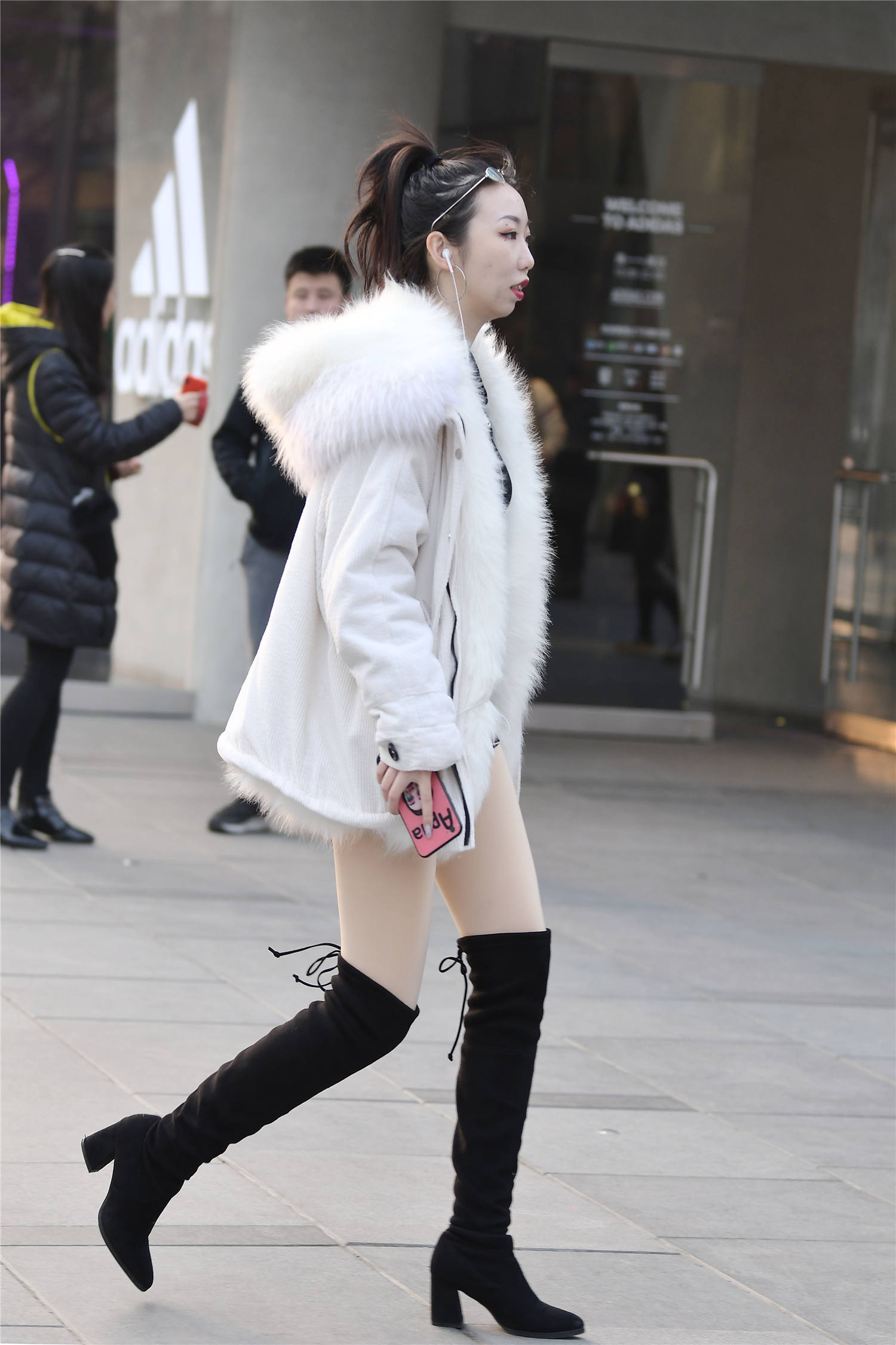 到了春天,要搭配出春天的味道,穿出自己的感觉,每一位时尚姑娘,有着自己的搭配想法,春天穿着过膝靴,时尚漂亮,还衬托自己的气质,这位美女选择一款修身的过膝靴,衬托出腿型的纤细,搭配白色的打底袜,修身效果也非常好,一款白色的皮草外套,穿出很美的效果,为了自己精致,姑娘发型盘起来,显得非常简约干净。