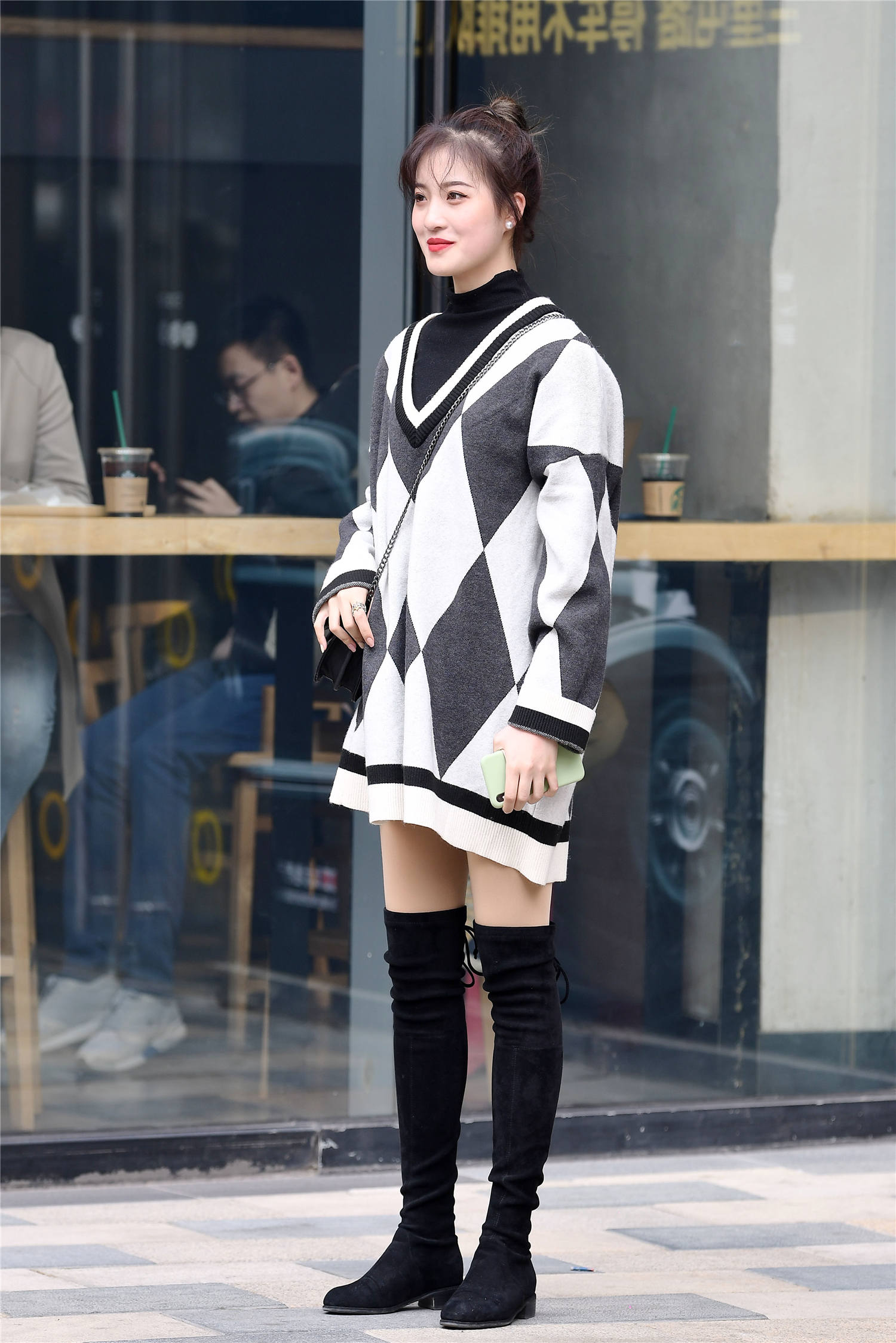 到了春天,搭配还是很有自己的感觉的,这位美女的搭配非常简单,一款黑色过膝长靴,当然里面穿着裸色的打底裤,增加保暖却有着非常好看的效果,一款长款的外套,深灰色与白色的菱形设计,增加层次感,里面一款黑色的高领衫,简单又非常时尚,这样的搭配非常简单,头发盘起来,这样显得非常精致。