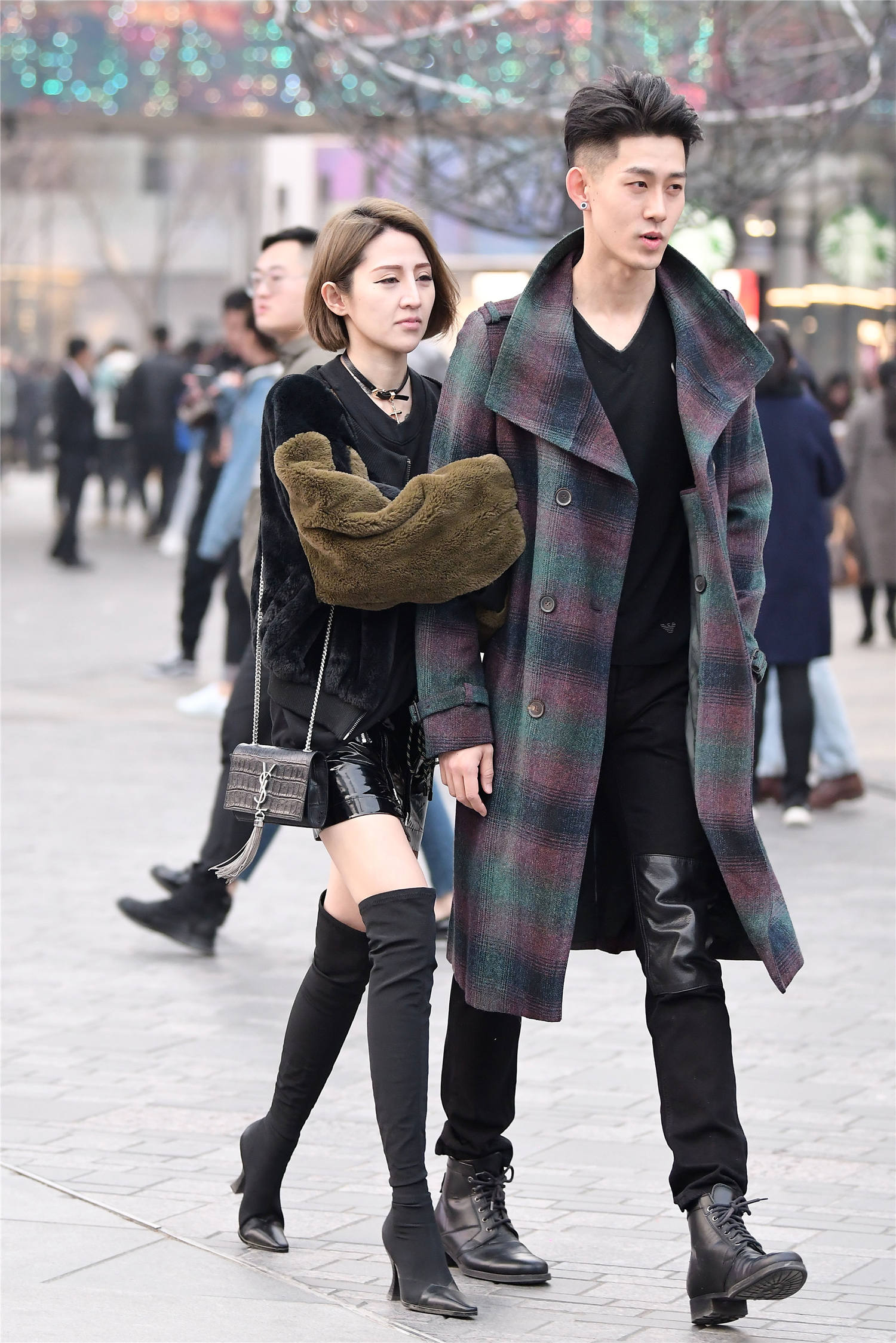 这位美女和自己的闺蜜一起去逛街,她选择搭配带着一点清凉的感觉,一双黑色皮靴,修身的设计,非常有质感,也搭配出显瘦的感觉,平底的款式,穿着会有着小女生的感觉,黑色的皮短裤,搭配出很精致的感觉,黑色小衫外面一款黑色短款的棉服,特意没有系扣子,这样会展现出她的内搭。