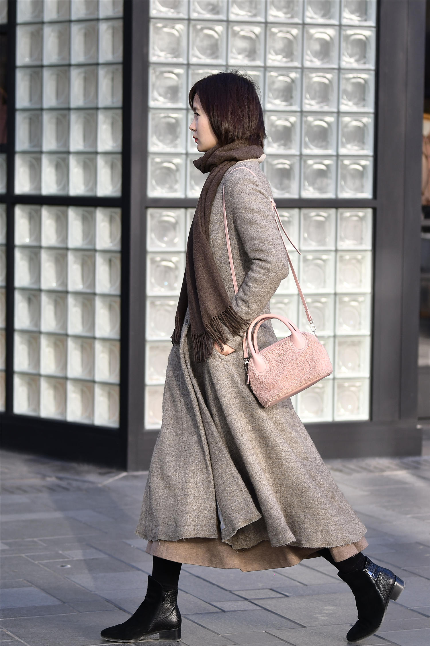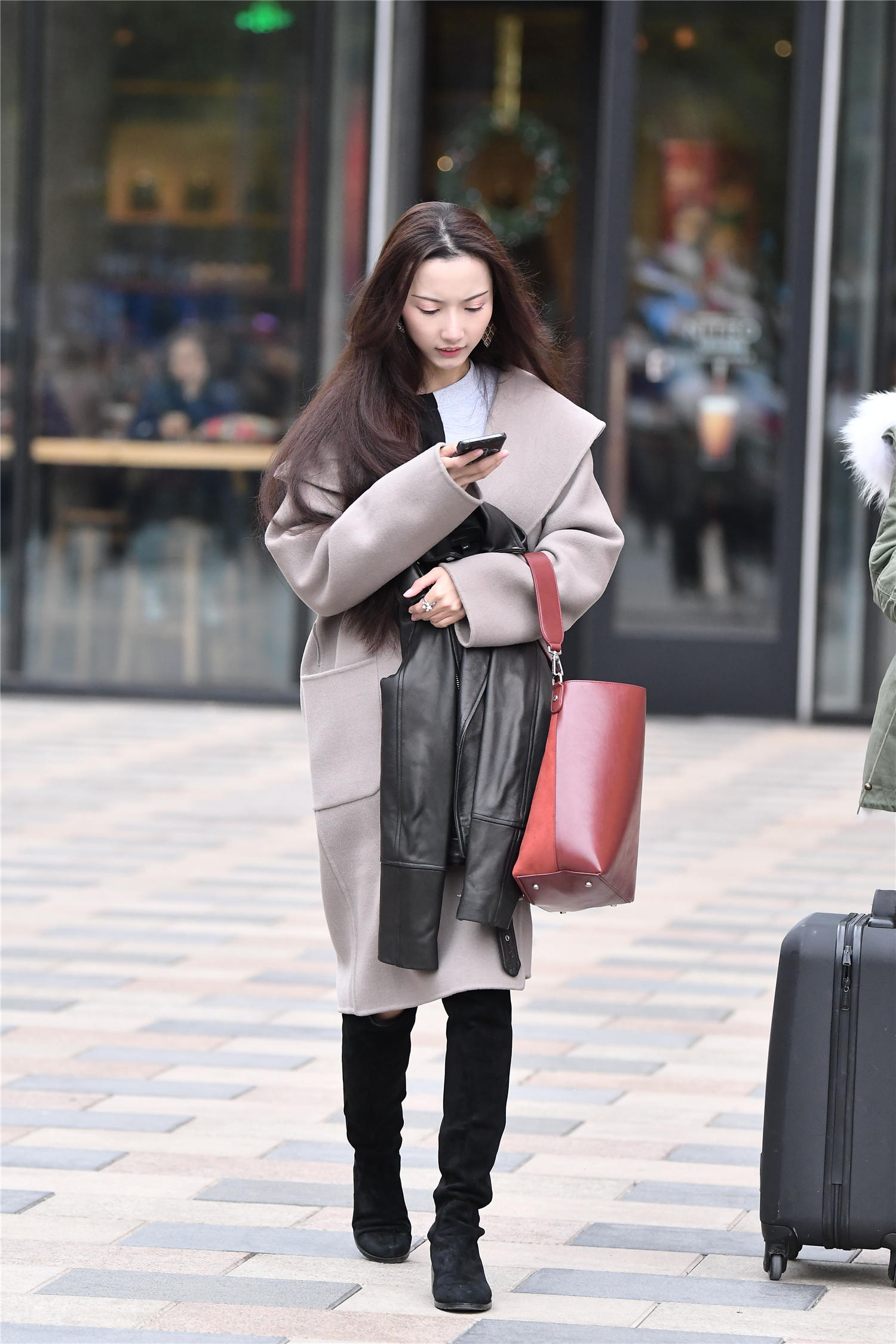你想搭配出什么风格,就去学习一下别人是如何搭配,这位美女选择一款休闲的灰色呢子风衣,领口非常简约,却衬托出很美的效果皮夹克拎在手里,一款酒红色的拎包,硬质的皮面,非常好看,也非常有质感,脚下一双黑色的磨砂皮长靴,搭配出简单的效果,这样穿搭适合小女生,可以搭配出减龄的效果。