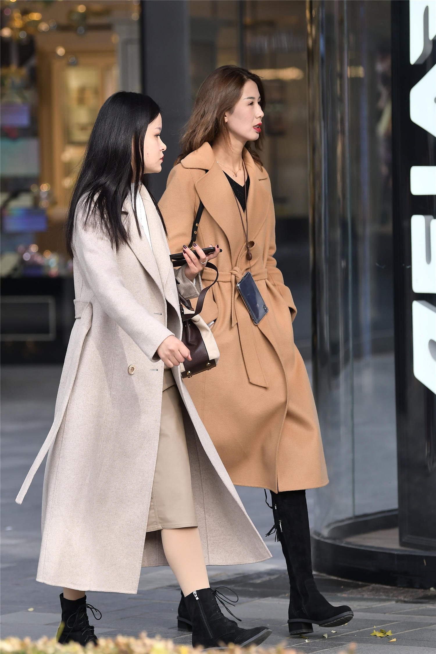 时尚的姑娘有着自己的搭配想法,也会展现出自己的精致感觉,这两位美女都选择大衣,以为选择灰色长款的风衣,敞开衣襟,这样有着走路带风的感觉,搭配黑色短靴,里面是黑色打底裤,这样很保暖,一位选择中驼色长款的风衣,腰间的腰带系起来,搭配一款黑色长靴,搭配简单,还有着很好的显瘦效果。