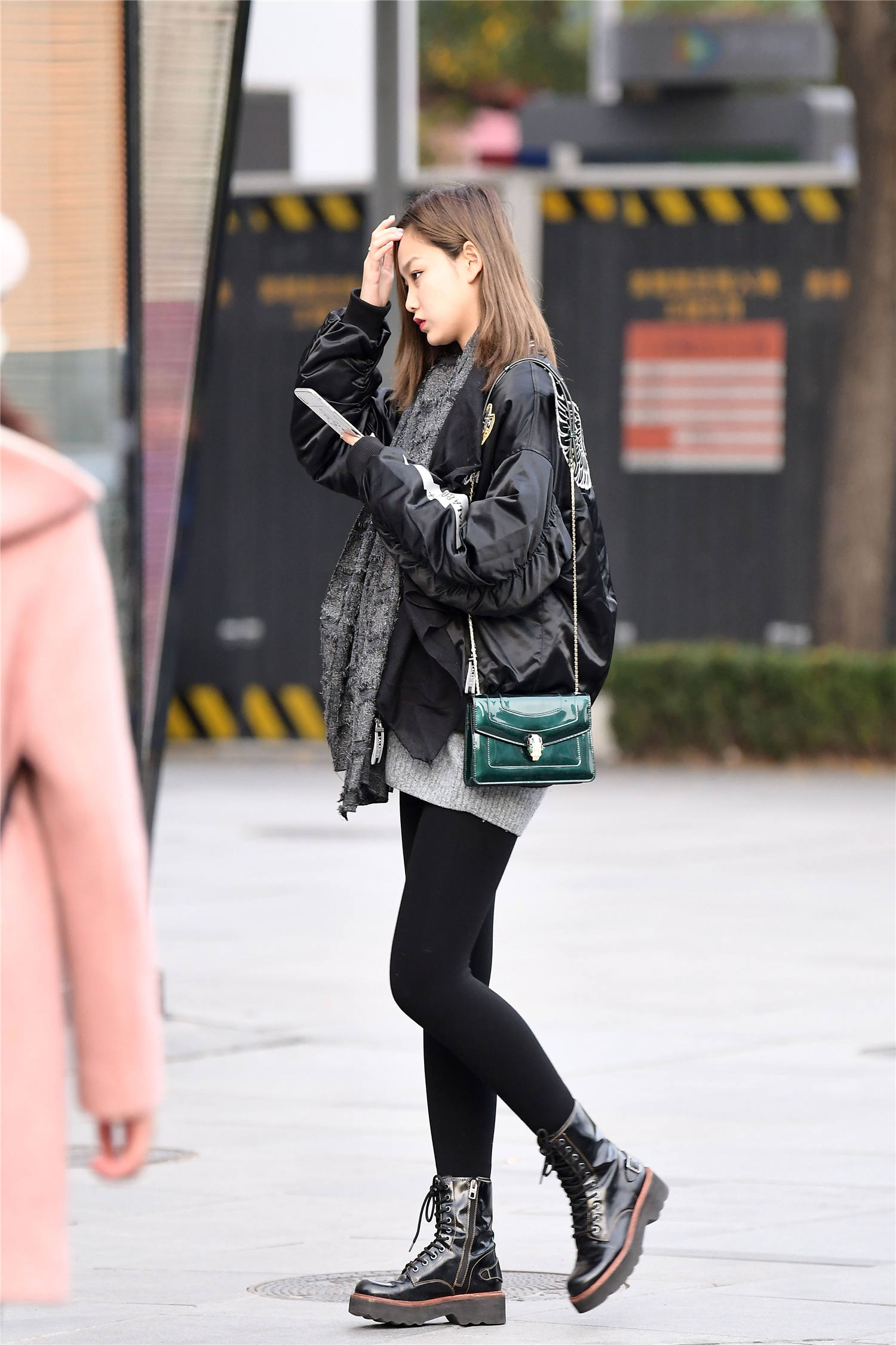 搭配时尚的姑娘,她们展现的风格也不一样,也有很多年轻的姑娘出来,搭配出朝气的感觉,这位美女选择一款黑色的“光腿神器”搭配一双黑色漆皮的马丁靴,系带的设计,非常简约,厚底的款式,会有着很好的保暖效果,也搭配出小女生的感觉,灰色的卫衣,一款黑色的夹克,灰色的围巾直接搭在脖颈处,简单时尚。