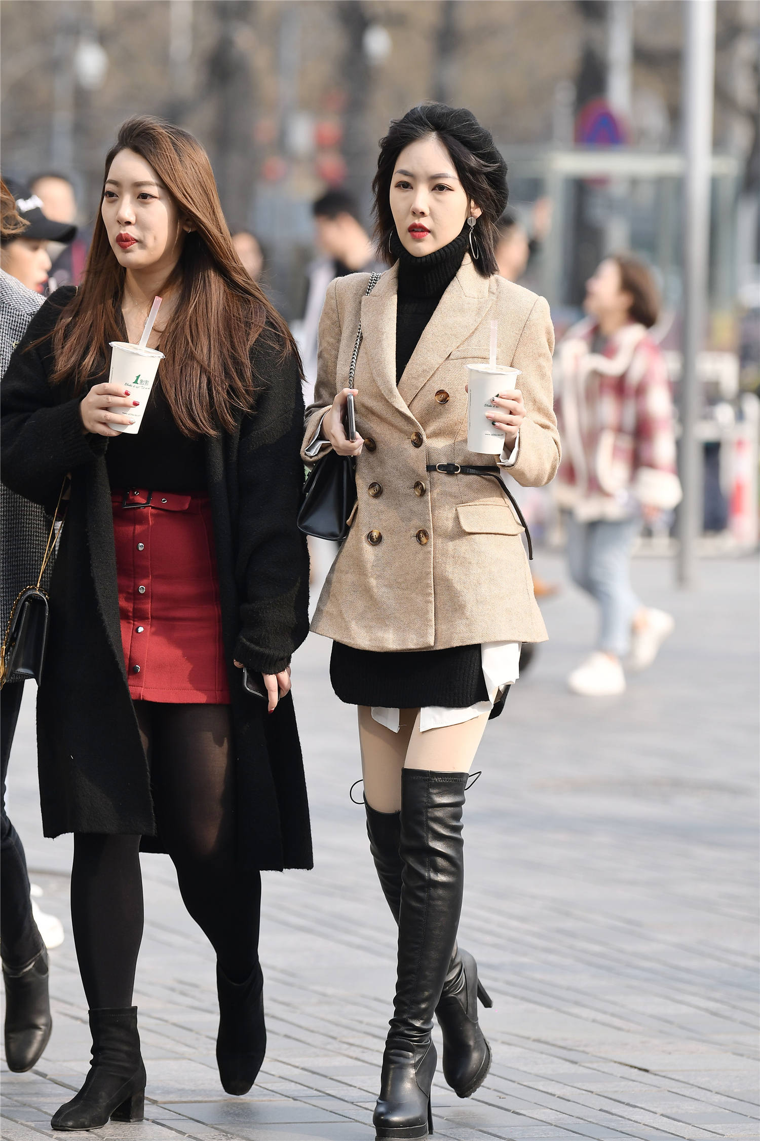 春天的搭配,注意保暖,还要穿出显瘦的效果,对于逛街的时尚姑娘也是一种考验,而很多时尚姑娘会选择这款搭配,修身显瘦,还衬托出自己的身材,就是“光腿神器”,这位美女选择黑色的过膝长靴,高跟的款式,搭配白色的“光腿神器”,简约显瘦,还衬托出好身材,黑色短裙搭配一件米色的西服,里面的黑色高领衫,有着显瘦的感觉,也搭配出自己的味道。