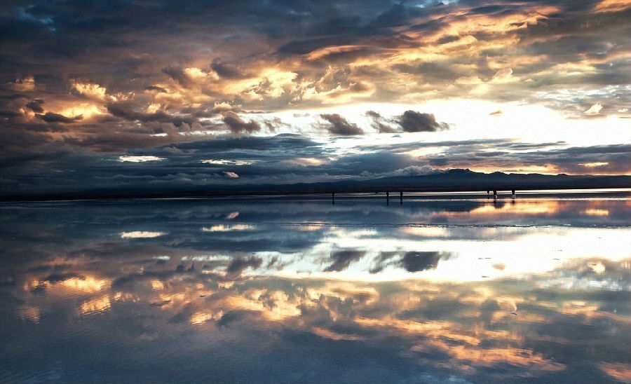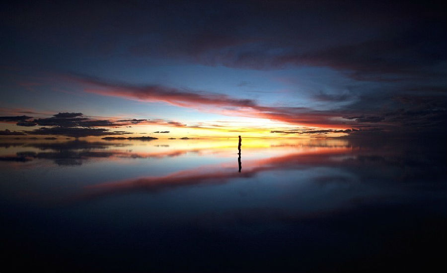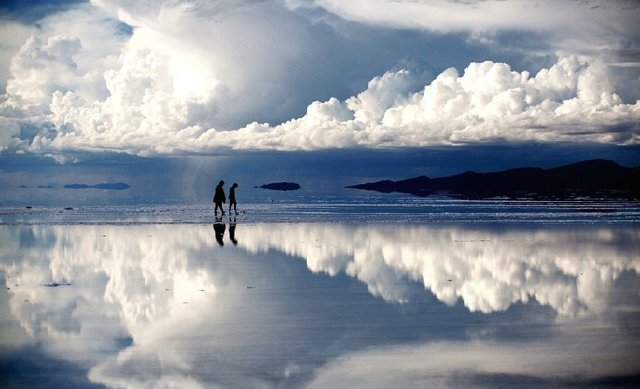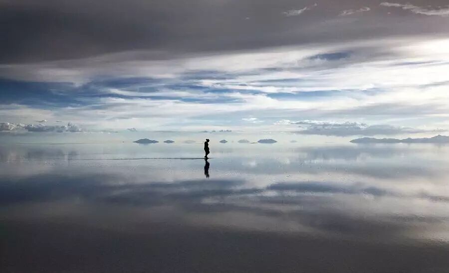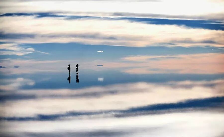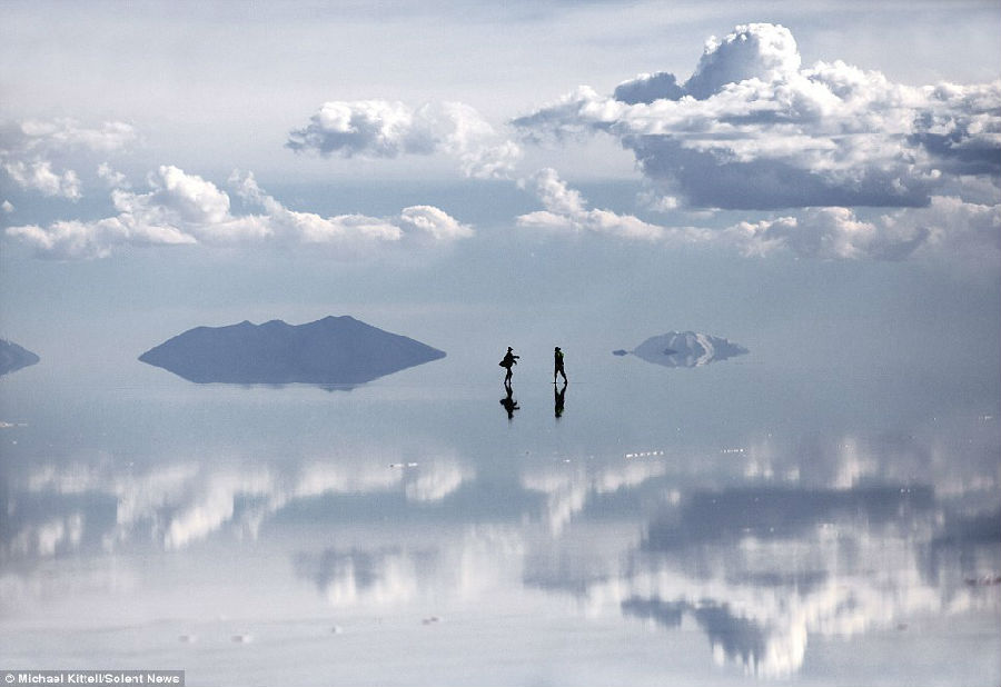 美国摄影师Michael Kittell与妻子Taylor环球旅行来到了玻利维亚的乌尤尼盐沼是世上最大的盐沼,这是一片地表有几厘米深的水覆盖的广阔平原,没有风,天空和云彩的景象完美的倒映在地面之上。