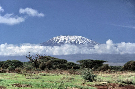 乞力马扎罗山(Kilimanjaro)位于坦桑尼亚东北部及东非大裂谷以南约160公里,赤道与南纬3度之间,是非洲最高的山脉,也是一个火 山丘。该山的主体沿东西向延伸将近80公里,主要由基博、马温西和希拉三个死火山构成,面积756平方公里,其中央火山锥呼鲁峰,海拔5,892米,是非 洲最高点。乞力马扎罗山素有“非洲屋脊”之称,而许多地理学家称它为“非洲之王”。该山的主体以典型火山曲线向下面的平原倾斜,平原的高度约海拔900 米,山顶终年满布冰雪,但冰川消融现象非常严重。该山四周都是山林,生活着众多的哺乳动物,其中一些是濒危灭绝的物种。