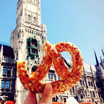 Melissa在宏伟的科隆主教座堂前高举起手中的粗粮面包三文治!