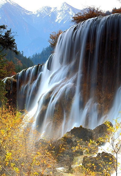 毫无疑问,九寨沟是中国最美的景区之一,九寨沟瀑布群也是中国最洁净的瀑布之一,九寨沟最宽阔的瀑布叫诺日朗,高约30米,宽达百米,水从静海穿林过滩慢悠悠地流来,凌空而下,银花四溅,那种纯净的色彩真是令人心醉。