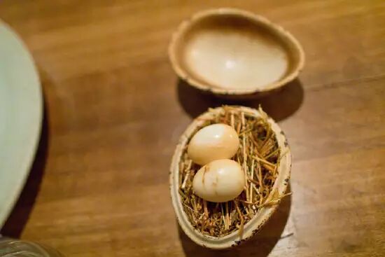 第九道,蛋中蛋,是NOMA的特色菜,烟熏过的鹌鹑蛋装在特制的蛋型容器之中,下面草垛一样的材质也是可以吃的。