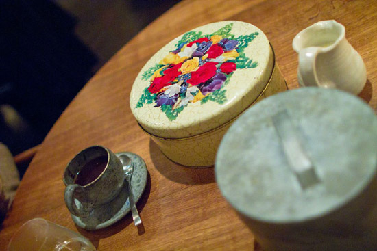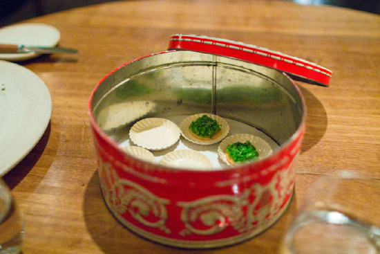 第四道,装在锡制饼干盒中的饼干奶酪,配植物种子与茎叶。