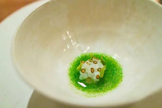 正菜来袭!第13道,也是第一道主菜,鱿鱼配未成熟的黑刺李浆果与白醋栗、松叶泡沫。Jose说生忧郁吃起来“如丝般顺滑”,味道极好!