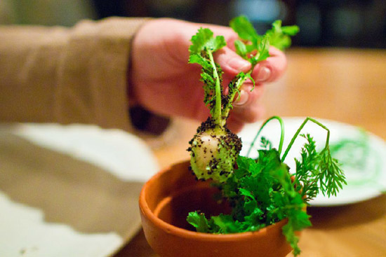 第十道,萝卜盆栽,需要把萝卜从麦芽制成的土壤中拔出,然后站在特制的酱中食用。