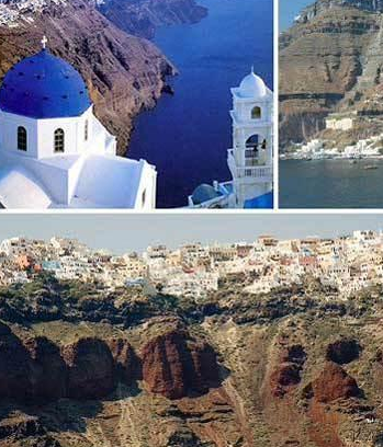 圣多里尼海岸线上崎岖的悬崖见证了这个壮观美丽的希腊岛屿动荡的历史。高980英尺(约300米)的悬崖由浮石层、火山灰和岩浆凝固形成。据估计,圣托里尼下面的火山在过去的20万年里喷发了12次,公元前1650年的灾难性喷发是地球在过去1万年来最大的火山爆发之一。那次火山喷发的影响可能导致位于克里特岛先进的米诺斯文明的崩溃,甚至有人说“失去的亚特兰蒂斯大陆”传说由此而来。
