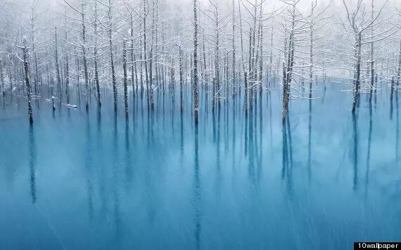 这儿是日本北海道美瑛的“蓝色池塘”。其景色随着光线的变化而有所不同,非常漂亮。