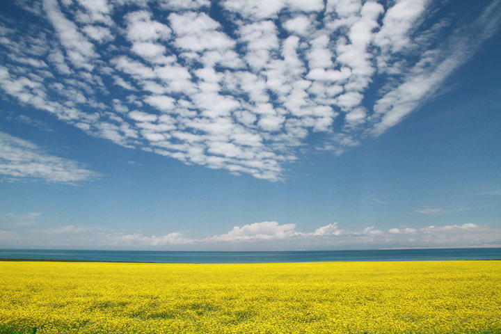 到了7月盛夏时节去青海湖,自然是奔那一片金灿灿的油菜花而去。如果说江西婺源、云南罗平等南方的油菜花海是一种温婉秀丽的美,那么带有浓郁高原特色的青海湖油菜花便是另一种风情:浓烈灿烂,动人心魄。驱车前往,在苍茫的地平线尽头,随着一抹深蓝色渐渐扩大成带状,穹庐般的蓝天下,大片大片金黄的油菜花渐入眼帘。远处隐隐约约的雪山,蓝宝石般的湖水,仿佛伸手可及的大朵白云……简直就是一幅浑然天成的油画。