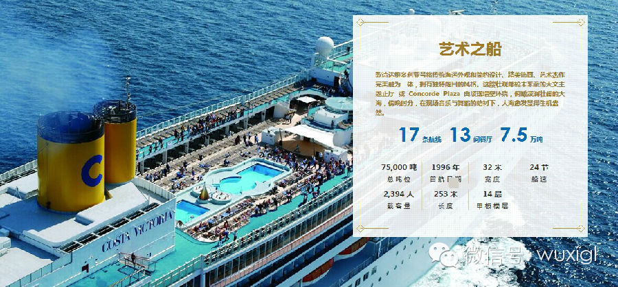 “维多利亚号”:歌诗达维多利亚号将传统海运外观和简约设计、精美饰面、艺术杰作完美融为一体,拥有独特醒目的风格。