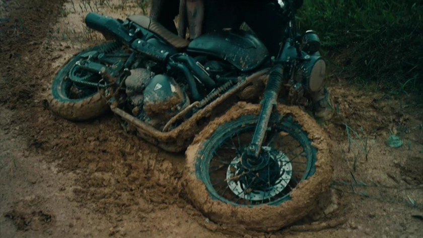 雨水瓢泼里骑向600多公里外的机场,小伙伴之一的安东尼不慎摔车。幸而车残人无恙,彼此还有心思开摔车姿势的玩笑。