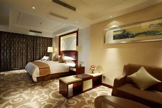 入住酒店会有酒店人员在前引导。打开房门,窗帘就会自动拉上。打开灯,红底金花的地毯,巧妙的吸去了脚步声,同时也让人有置身于家中的感觉。金色的墙纸,洁白的被单,温暖的颜色协调的搭配着。