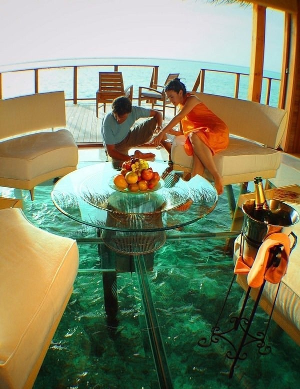 11. 在马尔代夫,体验玻璃地板的海上小屋。