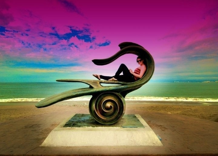 19. 在墨西哥Puerto Vallarto,坐在沙滩雕塑中。