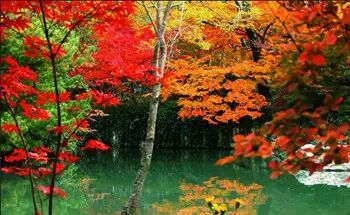 九寨沟的秋天漫山遍野、姹紫嫣红,片片火红的枫叶,团团黄栌的叶片、郁郁葱葱的青松、辉辉煌煌的杨树,沐浴在一片金黄黛绿之中,绯红的救兵粮,晶莹的小檗果,犹如串串夺目的玛瑙,镶嵌在五光十色的壁毯上,山水云天,交相辉映,织成一幅使人心醉的金秋画卷