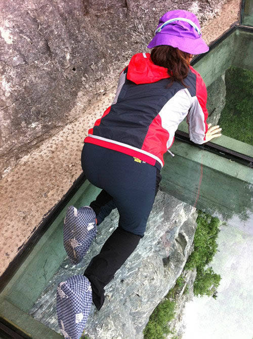 一位韩国阿姨自创的一种走玻璃栈道的“安全姿势”