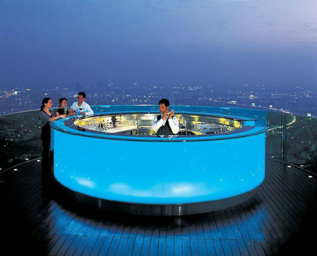 The Sky Bar坐落在曼谷莲花大酒店的屋顶,63层楼的高空下面是曼谷繁华的街道,你可以一边喝着香槟一边欣赏流光溢彩的城市。