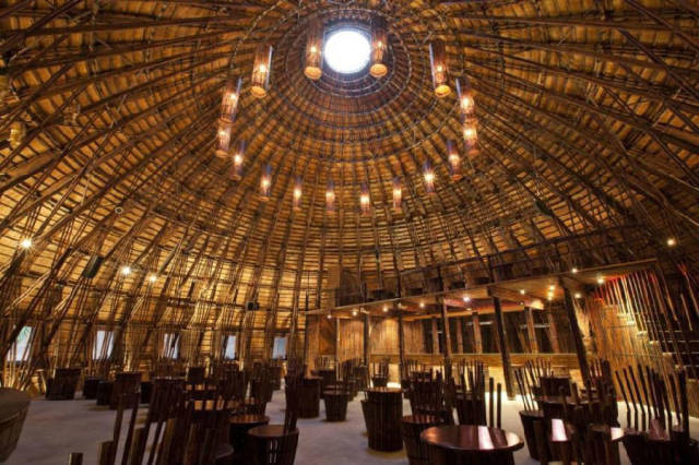 酒吧与当地的水元素进行了很好地映衬结合,沿着石头路就能走到巨大的茅草屋中,房屋四周茅草被温暖的灯光点亮,营造了极其舒适温馨的环境,再品上两杯酒就更加完美了。