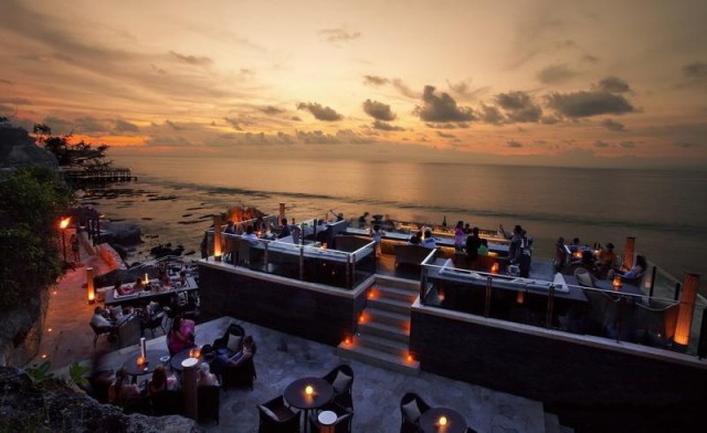 坐落在巴厘岛的悬崖边上,the Rock Bar的前面就是一望无际的印度洋,最美不过日落时分,整个大海和天空都像被施了绚丽的魔法一般。