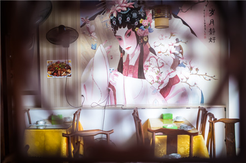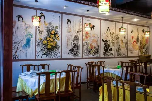 这里的环境古色古香,木质的手工桌椅雕工精良,雪白的墙面上鲜艳的油彩勾勒出中国古代女性的柔美曲线,描绘着神州大地万里江山的壮丽多娇,每一处的细节都能让人体会到主人的别具匠心。