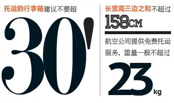 如前所述,大部分航空公司都有提供免费托运服务,经济舱机票一般可免费托运一件行李及允许携带一个手提行李或小行李箱登机。而除行李尺寸外,也要注意各个航空公司对行李总量的规定,如,乘客可免费托运的行李,国航和汉莎航空规定每件不超过23