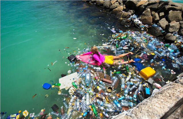 大量的塑料垃圾呗潮水冲到了岸边,艾莉森趴在冲浪板上小心地游过。