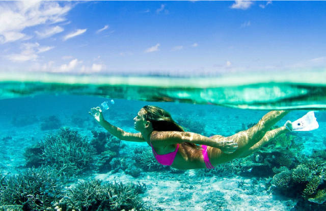 在如水晶般透明的海水中,艾莉森抓住了一个漂浮在水中的塑料瓶。