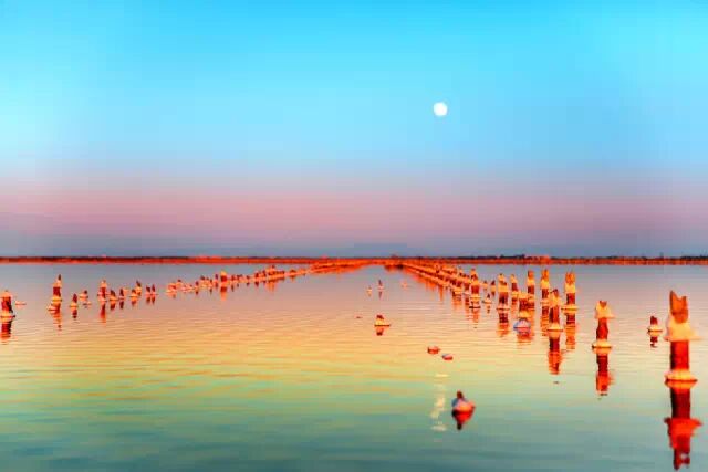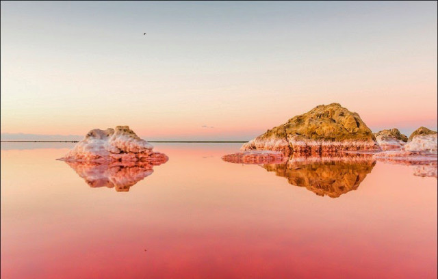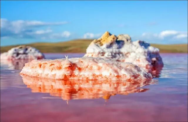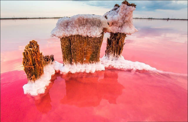 这里可以看见被废弃盐池中水红得异常醒目,与蓝色的天空形成鲜明对比。这一现象是由玫瑰色的盐杆菌藻类所形成的,它们能够适应盐度极高的盐水环境,而且能够快速繁殖。盐矿被废弃后,湖面上形成了巨大的盐晶体。如今,这一地区的独特景观已为当地人所熟知,但外地游客并不是很了解。
