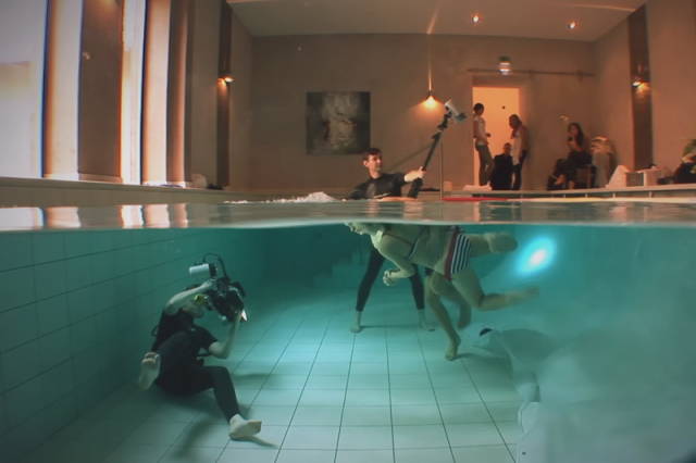 下午12点点时候,开始拍照,在大家轮流下水拍照的时候,还要确保光线能够照射到客人,随着时间的推移,除了摄影师自己的闪光灯外,还需要考虑到自然光的变化,并伴随着进行位置的调整,从什么角度拍摄更好,毕竟,最好不要让人看出这是一个游泳池,摄影师是希望表现一个超现实主义的时刻。
